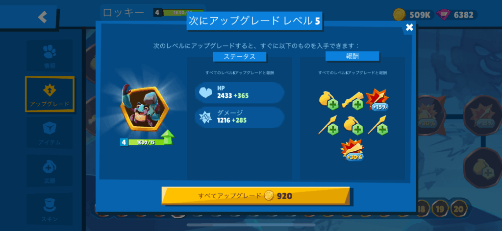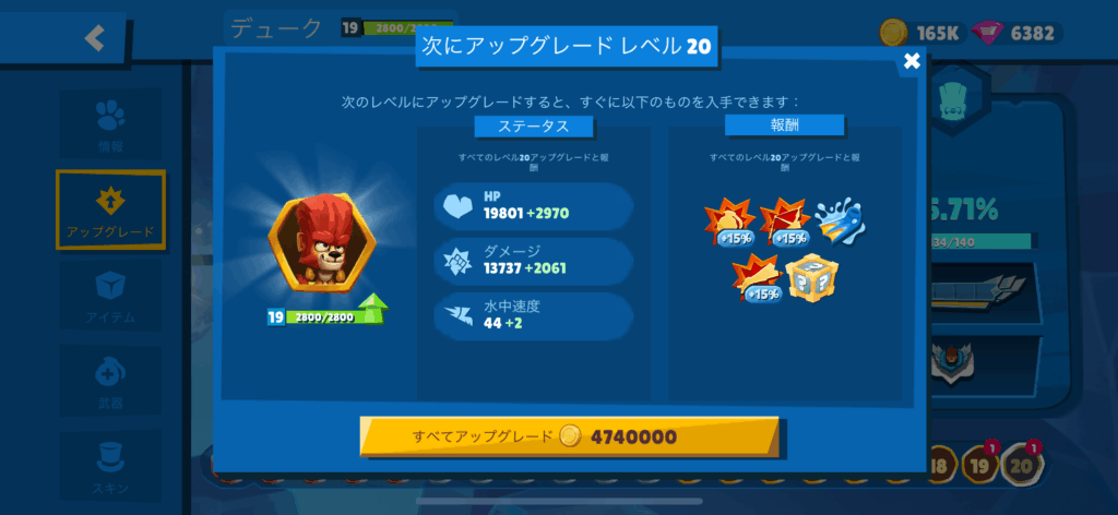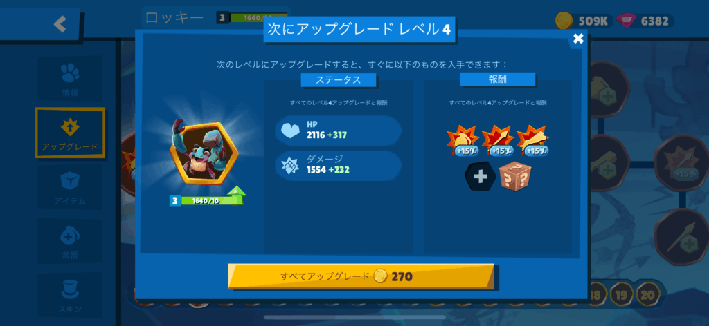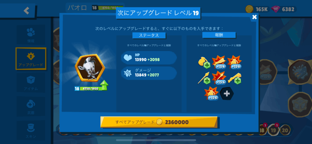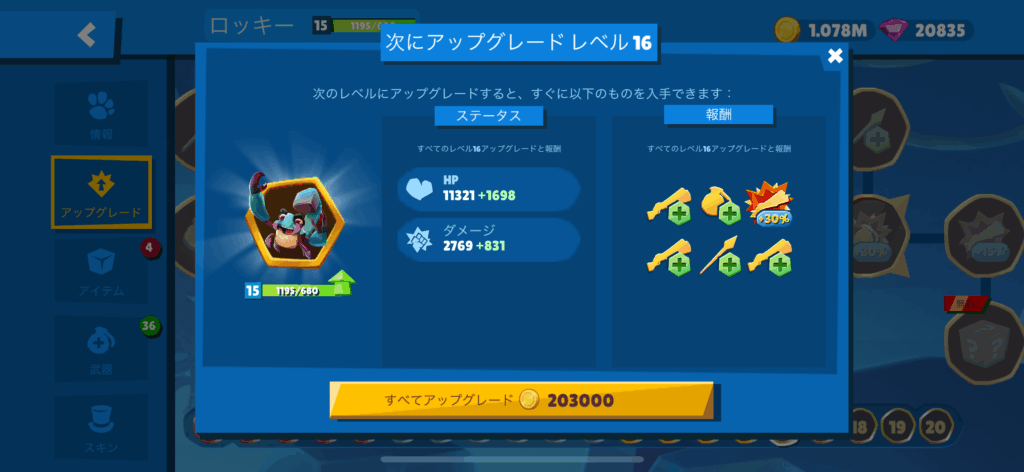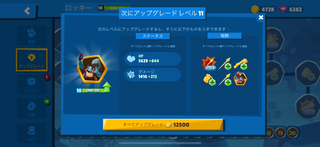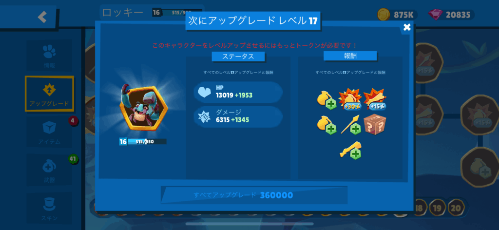 最近気づいたんだけど、この19から20にコインで開放する15%UP等はレベル20になったら反映されます。コイン使って解放した段階で反映されると思っていたらそうじゃなくて20になったらパワーアップしています。いつから?勝手に変更するなよ。この9千のトークンがきついんだから・・・